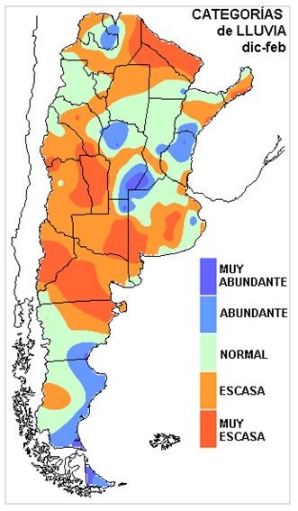 Si hacemos una análisis trimestral de las precipitaciones, el que resume el trimestre de verano (dic-feb), vemos una oferta de agua más cercana a la normal, al menos el territorio con buena provisión de lluvias tiene un despliegue más amplio.