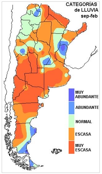 Como puede observarse, al computar todo el semestre, aparecen dos zonas con excesos pluviales o al menos lluvias normales. Una sobre el centro de la Mesopotamia y otra en el oeste de la zona núcleo. Mientras que sobre la Mesopotamia la concentración de precipitaciones en la primera parte del verano fue significativa, sobre el oeste de la zona núcleo la distribución temporal fue más favorable.