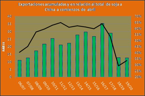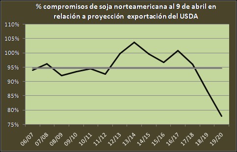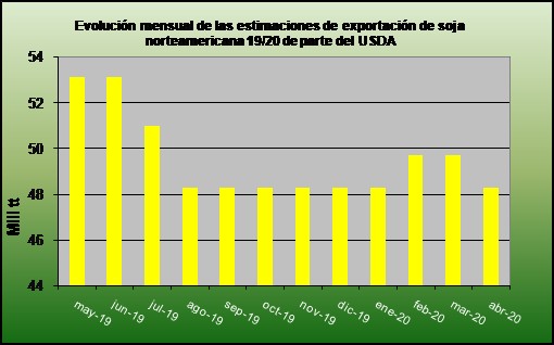 En este sentido, USDA ha proyectado en su reporte de abril que los envíos norteamericanos al mundo al final del período 19/20 (el año comercial culmina a finales de agosto) serían ligeramente mayores a 48 mill t, lo que ubica esta variable en un piso muy lejano a las 53 mill tt estimadas en el bimestre mayo-junio del año pasado (cuando se conocían los primeros números para esta campaña).