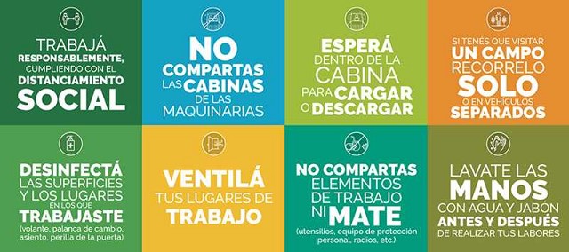 En el mismo sentido, en cualquier operación realizada con maquinaria -pulverización, cosecha, siembra, picado- deben evitarse las concentraciones de personas o reuniones, y prestar una mayor atención al orden, limpieza e higiene de las casillas que los contratistas utilizan como alojamiento de su personal en el campo, para tareas que demanden varios días de trabajo. Además, debe reducirse al mínimo la cantidad de personas que deban pernoctar allí.