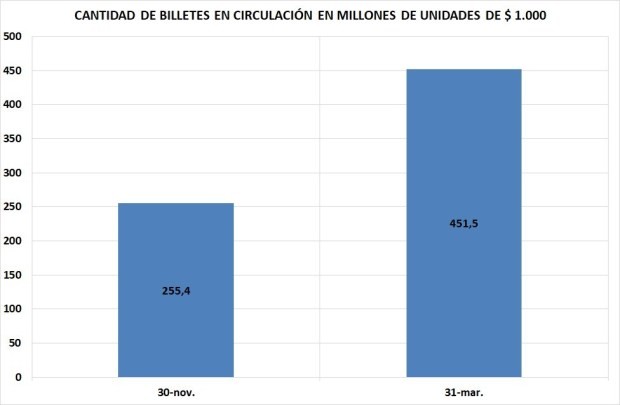 Por su parte, la base monetaria tuvo una expansión del 41% en los últimos 30 días y del 90% en los últimos 12 meses. La emisión monetaria queda en evidencia con el crecimiento de los billetes de $ 1.000 que hay en circulación. Si comparamos el total de billetes en circulación entre el 30 de noviembre de 2019 y el 31 de marzo pasado, creció en 251,5 millones de unidades. O sea, hay 251,5 millones de billetes más circulando, pero el dato relevante es que disminuye la cantidad de billetes de 5, 10, 50 y 100 pesos y aumenta muy fuerte la cantidad de billetes en circulación de 500 y 1.000 pesos. Entre el 30 de noviembre y el 31 de marzo, la cantidad de billetes en circulación de $ 500 pasó de 773,8 millones de unidades a 887,8 millones de unidades en tanto que la cantidad de billetes de $ 1.000 aumentó de 255,4 millones de billetes a 451,5 millones de billetes.