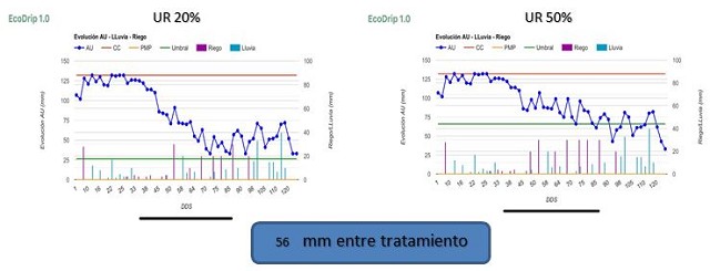 La diferencia de riego entre umbrales no sólo pagó el costo del mm sino que también dio un saldo positivo de 103 dol/ha por el aumento de producción de 13 qq de maíz a favor del UR 50%, con una EUA (eficiencia del uso el agua) de 32 kg de maíz/mm.