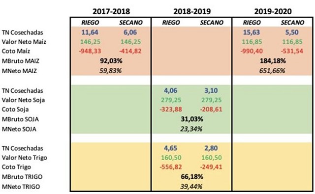 Según recuerda Jose Valinotto, esa campaña (2017/2018) fue un año muy seco, y se reflejó en un testigo en secano el cual sacó un promedio de 60qq contra 130 qq del riego del hibrido que más rindió con solo 150 mm de riego, logrando un aumento del 200% en el primer año. Lo que significó un margen de ganancia muy por encima de lo esperado. Luego del maíz, se sembró trigo y se obtuvo una diferencia significativa a pesar de la helada de ese año que provocó daños fuertes. El trigo del secano rindió 28 qq/ha y el goteo 47 qq/ha, lo que significó un aumento del 67%. Por su parte, la soja de segunda del año 2019 rindió 41qq/ha en el riego y en el secano 31 qq/ha logrando un 33% de aumento de rendimiento.