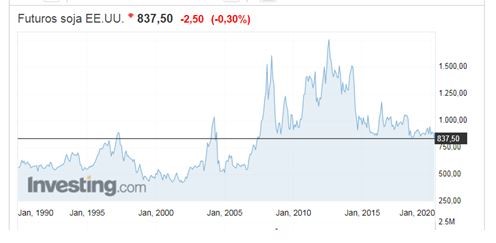 El cuadro de abajo muestra la baja que sufre la soja, después de haber alcanzado altos valores entre 2008 y 2014. Se ve claramente, el valle de la década del 90 y los primeros dos años del nuevo milenio.