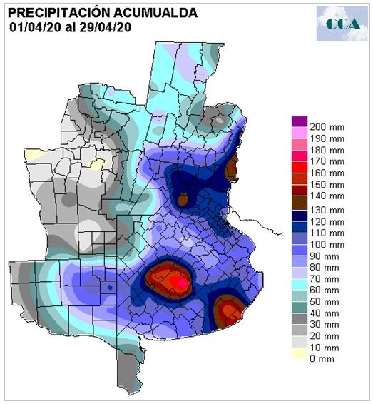 Del centro para el sudeste de BA hubo lluvias muy generosas e incluso algunos máximos destacados, en la zona de influencia de Olavarría y Mar del Plata, pero todo el sector ha superado en abril los cien milímetros, una oferta de agua que los suelos del sudeste sabrán capitalizar.