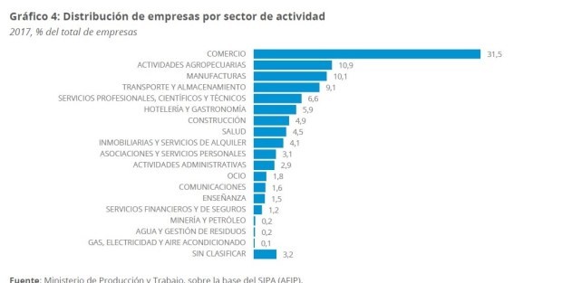 Las PYMES generaban el 77% de los puestos de trabajo, en tanto que las grandes empresas generaban el 23% restante de los puestos de trabajo. Al mes de febrero, presentaron declaraciones para pagos de aportes y contribuciones patronales 541.871 empresas, de las cuales 486 empresas eran estatales y el resto privadas. Es decir, quedaban al mes de febrero 541.385 empresas privadas que pagaron aportes y contribuciones en comparación con las 609.000 que fuero censadas en 2017.