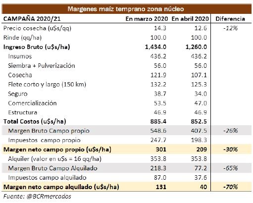 El maíz 2019/20 hizo historia en la región: fue record de siembra con 1,5 M ha y récord en producción con un volumen de 15 Mt. Falta mucho aún para la próxima siembra pero grandes nubarrones oscurecen el horizonte del cultivo y prenden la señal de alarma. El problema está en las cuentas que hace el productor. El margen neto del maíz temprano sufrió una caída del 70% en campos alquilados por la caída que sufrió el precio a cosecha en los últimos 30 días. Y la altísima inversión inicial del cultivo no es acorde a la rentabilidad obtenida con este nuevo escenario de precios. Hace un mes atrás, el maíz a 143 U$S/Tn lideraba los márgenes productivos. Hoy el escenario es drásticamente distinto. Pero pese a esta caída en la rentabilidad, el cereal presenta mejores márgenes que la soja de primera y queda por debajo de la rotación trigo/soja de segunda. Aún falta mucho, pero parece poco probable que vuelva a hablarse de una siembra record para la campaña que comienza.