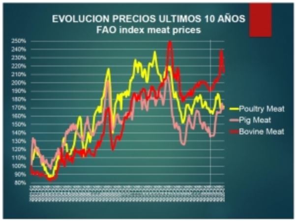 En cuanto a los precios, más allá de lo sucedido en tiempos recientes -a raíz de la caída causada por la crisis del mercado chino- en los últimos diez años, el valor de la carne vacuna más que se duplicó, según datos de FAO.
