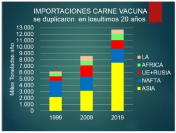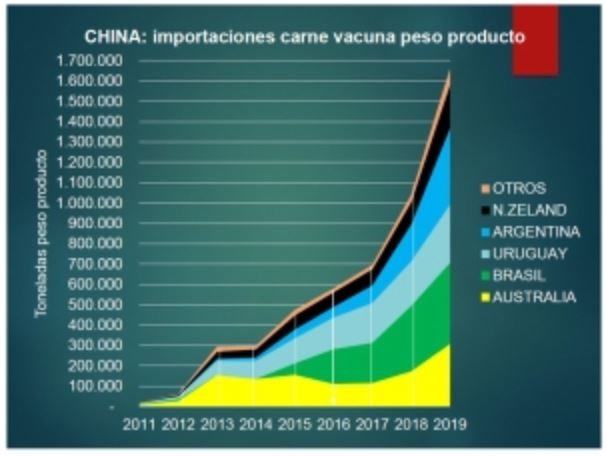 La importación de carne vacuna de China comenzó en 2011, básicamente desde Australia y luego se fue agregando Uruguay y Nueva Zelanda. "Pero hasta 2014 en que empezaron a jugar la Argentina y Brasil compraba sólo 300 mil ton", advirtió Tonelli, señalando que este canal comercial ha sido tan disruptivo que en apenas cinco años pasó de niveles insignificantes al 25% del mercado mundial. "Estamos hablando de que compran 1,6 millones de ton peso producto, que es la carne que se consume, aunque si lo expresamos en toneladas equivalente res con hueso, como se hace en la Argentina, estarían arriba de 2,5 millones", aclaró.
