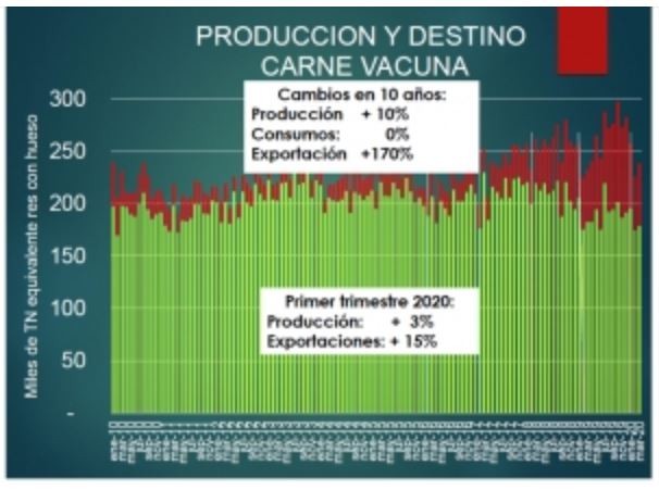 "La producción de carne aumentó el 10%, no es poca cosa: 1% anual. El consumo total se mantuvo, aunque bajó un poco por habitante, y la exportación creció 170%", sostuvo, detallando que a su entender las mayores ventas externas estimularon el avance de la producción, demostrando que "la ganadería es un sector dinámico, con enorme potencial y si se lo acompaña tiene mucho para dar a la sociedad". Y agregó: "pese a todo lo ocurrido en el mundo, en el primer trimestre de 2020 siguió creciendo, llevamos un aumento del 3%, y las exportaciones un 15%, comparadas con igual período del año anterior ".
