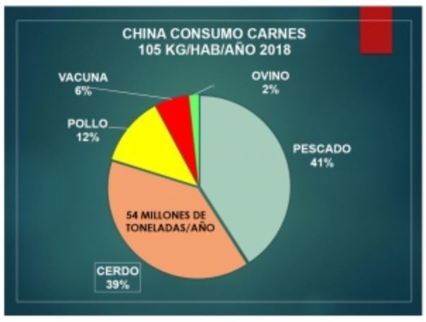 ¿Consumo de carnes en China? "Uno cree que los chinos no comen este tipo de alimentos, pero la ingesta de proteínas animales promedia los 105 kg/hab/año, si se miran los patrones anteriores a la peste porcina africana", propuso.