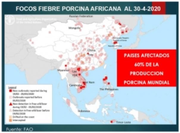 La peste porcina africana sigue generando nuevos focos semana tras semana. En el mapa se detallan en rosado los detectados hasta principios de abril y en rojo los de las últimas dos o tres semanas del mes, en distintos países del Sudeste Asiático, que representan el 60% de la producción mundial: China (el centro Oeste no es zona agropecuaria), Camboya, Filipinas, Corea del Norte, Vietnam, Laos e Indonesia, entre otros.