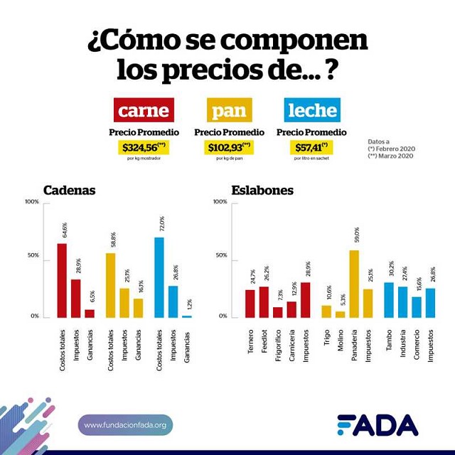 El informe de FADA demuestra que, la carne en marzo tuvo un precio promedio de $324,56 por kilogramo, de ese precio el ternero representa el 24,7% ($80,06), el feedlot el 26,6% ($85,30), el frigorífico el 7,3% ($23,62), la carnicería el 12,9% ($41,79) y los impuestos el 28,9% ($93,79).