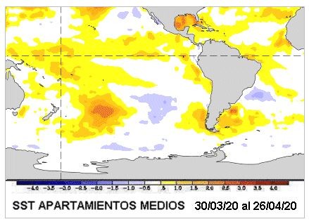 Se observan desvíos positivos de las temperaturas superficiales del mar en el Atlántico sur y el Pacifico sur, es decir, las corrientes de Malvinas y Humboldt, están más cálidas que lo normal para la época. Potencialmente esto puede jugar un efecto moderador de las irrupciones de masas de aire frío provenientes de estas dos zonas oceánicas. Esto podría dejar un invierno con menos rigor térmico, lo cual no quita que se den irrupciones de aire frío destacadas como las que se esperan para mediados de la semana próxima.