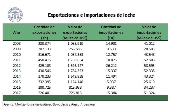 En el caso del sector externo, las exportaciones han sufrido una reducción de aproximadamente el 20% en cantidades de toneladas y de un 32% en cantidades de dólares ingresados al país. Por el lado de las importaciones, el volumen ha variado mucho de año a año, pero podríamos afirmar que comenzó y cerró el período analizado (2008-2017) con sólo un 3,2% de aumento. Pero las importaciones finales serían mayores en un 9,95% al volumen promedio importado en estos diez años (13.992 toneladas). Además de ello, importar 15.384 toneladas en el año 2017 significó un desembolso 25% mayor que lo gastado en 2008 para importar 14.901 toneladas de productos lácteos.