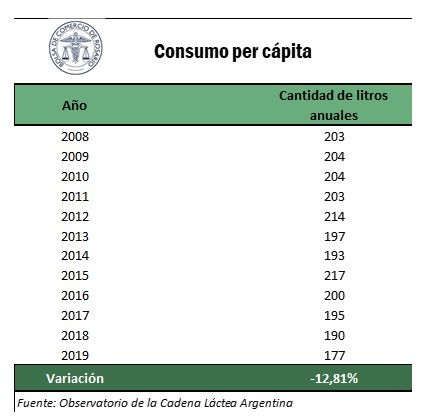 de los 214 litros de leche per cápita por año del año 2012, el consumo cae por