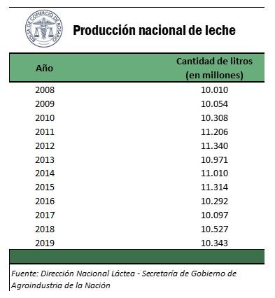 Al analizar la producción de leche se podría afirmar que la misma se ha mantenido constante. Principalmente porque a lo largo del período 2008-2019, aunque se hayan dado variaciones de producción, entre el inicio y el cierre del intervalo histórico analizado sólo se creció un 3,33%. En adición a lo anterior, en caso de extender el análisis a 1999 el efecto producido es idéntico. La producción total para dicho año fue de 10.329 millones de litros, y la producción para el año 2019 fue de 10.343 millones de litros. Con lo cual podría afirmarse que el crecimiento entre 1999 y 2019 es del 0,13%.