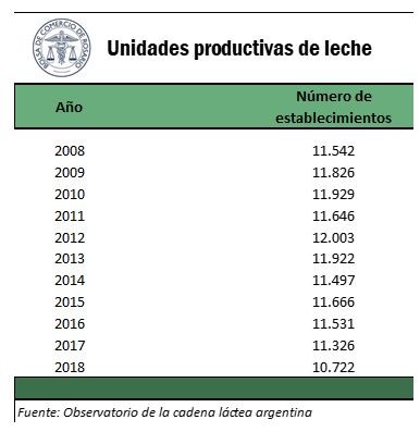 El sector lácteo nacional orienta aproximadamente el 80% de su producción al consumo interno y 20% a exportaciones. Por ello, el consumo doméstico (determinado en gran parte por el nivel de ingreso nacional) y la demanda externa son dos de los principales determinantes de la producción en el país, además del precio de los lácteos que determina la rentabilidad tambera. En este sentido, la cantidad de unidades productivas de leche en Argentina evidencia un retroceso entre el inicio y el final del período estudiado. En 2008, 11.542 establecimientos producían leche en Argentina para contabilizar en 2018 los 10.722 establecimientos. Pero dentro de este período existió una tendencia alcista a hasta el año 2012 donde se alcanzaron los 12.003 establecimientos. En dicho año se dio un quiebre en el sector lácteo nacional y desde entonces el número de unidades productivas no ha dejado de descender hasta el año 2018.
