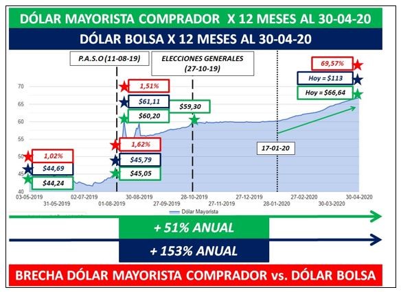 3.La Brecha entre el Dólar Mayorista Comprador y el Dólar Bolsa pasó del 1% en mayo de 2019 al 69,57% el jueves 30 de abril de 2020.