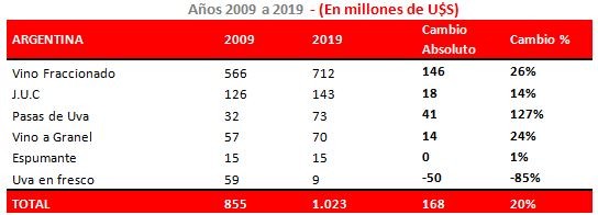 En 2009 la Argentina exportaba en total U$D 855 millones, los cuales se repartían mayorita-riamente entre vino fraccionado y jugo de uva concentrado. A partir de dicho año, comenzó a verse un crecimiento sostenido en las exportaciones a partir de una diversificación de productos con nuevos protagonistas como el vino a granel, que creció un 24%, y, sobre todo, las pasas de uva, que tuvieron un crecimiento que llegó hasta el 127% en el acumulado de la última década.