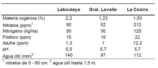 Los ensayos se realizaron en tres lugares del sudeste de Córdoba. Los lugares fueron: Laboulaye (LB), General Levalle (GL) y La Cesira (LC). Estos sitios tienen características edáficas y climáticas distintas. El suelo en LB fue franco arenoso, bien drenado, con la presencia de la capa freática entre 2 a 2.5 m de profundidad. En GL fue arenoso franco, bien drenado, con influencia de la capa freática mientras en LC el suelo fue franco con problemas de drenaje por la presencia de un horizonte denso (Bt) a 0.6 m de profundidad y sin presencia de la capa freática.
