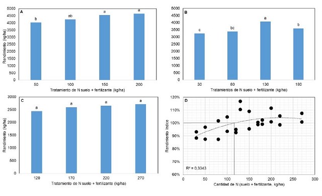 Gráfico 1. Respuesta del rendimiento a la fertilización nitrogenada para Laboulaye (A), General Levalle (B), La Cesira (C), y relación rendimiento índice con dosis de nitrógeno (suelo + fertilizante, D). Rendimiento índice 100 = 3500 kg/ha. Letras distintas indican diferencias estadísticamente significativas para el test LCD de Fisher.