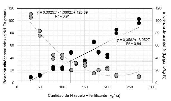 Gráfico 2. Relación entre la cantidad de nitrógeno (suelo + fertilizante) con la relación nitrógeno en grano (eje izquierdo) y eficiencia de uso del nitrógeno (eje derecho).