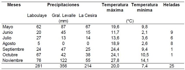 El Cuadro 1 muestra las condiciones meteorológicas durante el período de crecimiento del cultivo para los tres sitios. La precipitación fue mayor en GL (356 mm) en comparación a LB (281 mm) y LC (214 mm). La temperatura máxima media fue 20 ºC mientras que la mínima fue 7.4 ºC registrándose un total de 25 heladas meteorológicas durante el ciclo de crecimiento del cultivo. Estas condiciones de temperatura se corresponden con los registros medios de la región. Sin embargo, el número de heladas ocurridas supera los valores medios registrados en los últimos 15 años. Además, se registró una helada, de baja intensidad, en los primeros días de octubre que es anormal para la región. Esta helada no causó daños importantes en el cultivo.