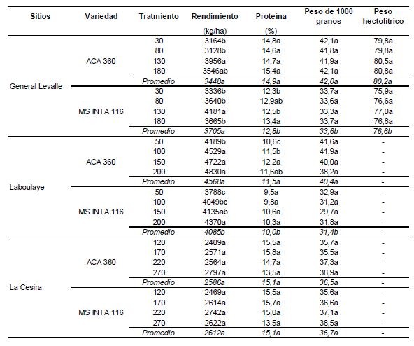 Cuadro 3. Resultados de rendimiento, proteína, peso de 1000 granos y peso hectolítrico de ambos sitios y variedades evaluadas en función de la dosis de nitrógeno.