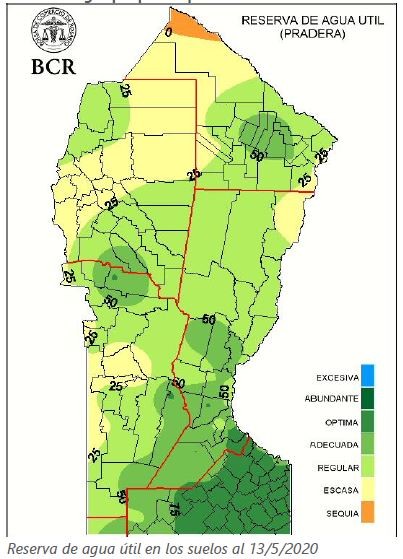 También hay buenas a muy buenas reservas en el sur y centro de Santa Fe, Entre Ríos, este de Córdoba, Chaco, Santiago del Estero y Salta. La amenaza está en la necesidad de lluvias para complementar estas reservas y particularmente la situación de escasez que se observa sobre todo en el oeste cordobés. La falta casi total de lluvias de esta primera quincena de mayo es también algo que preocupa al sector.