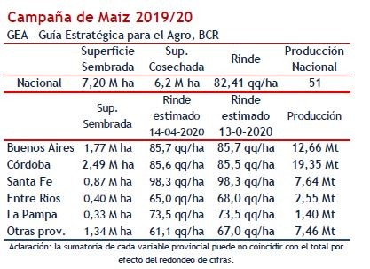 En este informe de mayo, se vuelve a subir la estimación de maíz, ya con un 45% de avance de las tareas de cosecha. Se ajusta el rinde nacional, ahora en 82,4 qq/ha, 1,25 quintal más que en el informe anterior. La razón de esta suba, 1,2 Mt más que hace un mes, se explica en gran parte por los mejores resultados de Entre Ríos, Chaco y Santiago del Estero y por un ajuste practicado en áreas de Córdoba que suma 60 mil ha en el norte.