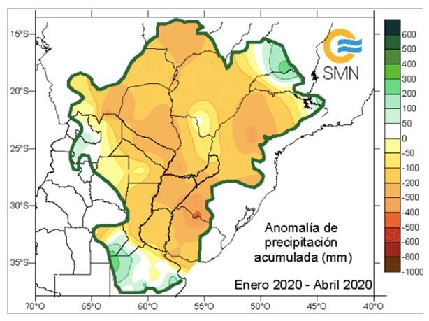 El SMN (Servicio Meteorológico Nacional), haciendo un trabajo conjunto con otras instituciones regionales, ha confeccionado un mapa que muestra a gran escala toda la zona que configuran los ríos que convergen sobre la cuenca del Plata. En él se puede observar la vastedad de la anomalía negativa de la precipitación en los primeros cuatro meses del año. Esta anomalía ya se venía perfilando desde la primavera, pero con el correr de estos meses se agravó.