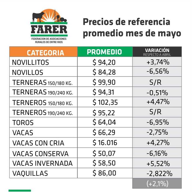 El informe de referencia condensa los promedios por categoría de los precios alcanzados en los remates realizados en la provincia de Entre Ríos y se realiza a partir de la información recabada por cada rural en las firmas consignatarias. De este modo, FARER puede brindar un servicio a los productores sobre los valores de referencia de la hacienda en pie a partir de datos confiables.