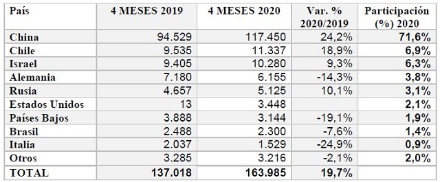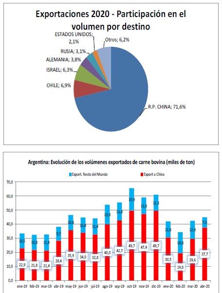 La República Popular China resultó el principal destino, en volumen, para la carne vacuna argentina durante los primeros cuatro meses del año 2020 con aproximadamente 117,5 mil toneladas, seguido por Chile, 11,3 mil toneladas, y luego por Israel, 10,3 mil toneladas. En cuanto al valor de las divisas ingresadas, el principal mercado durante el periodo ha sido China, que representa un (60%) del valor total exportado de carne vacuna enfriada, congelada y procesada en el periodo, seguido por Israel (9,2%), y Chile (8,4%).