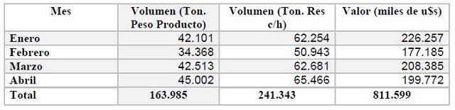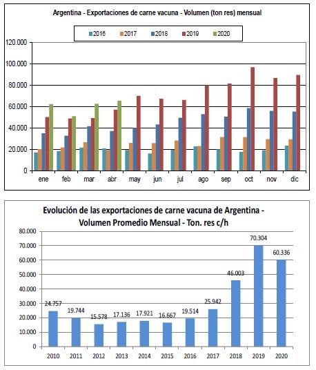 El volumen exportado mensual promedio de los primeros cuatro meses del año 2020 se ubica en 60,3 mil toneladas res con hueso, que resulta significativamente inferior, (- 14,2%), al volumen promedio mensual del año 2019, que había resultado de 70,3 mil toneladas res con hueso.