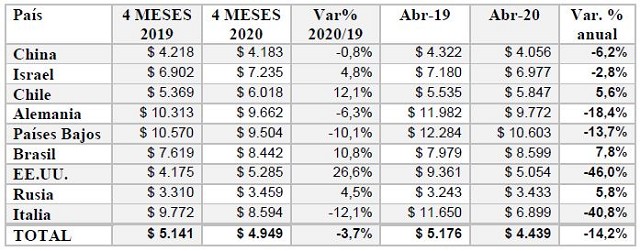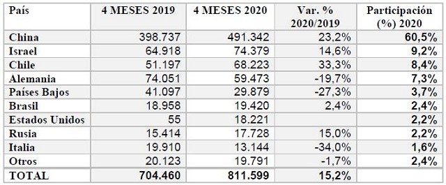 Si se comparan los embarques de los primeros cuatro meses del año 2020 con los correspondientes al período enero - abril del año 2019, estos mostraron un comportamiento variado con relación a los niveles de actividad que se habían registrado un año atrás: Estados Unidos, China y Chile muestran un crecimiento de magnitud significativa. Israel y Rusia muestran un crecimiento más moderado, mientras que Alemania, los Países Bajos y Brasil exhiben caídas moderadas a significativas. Finalmente, Italia muestra caídas de magnitud en los volúmenes de carne argentina demandados. La dependencia del mercado chino para las exportaciones de carne bovina de Argentina se ha vuelto determinante, y en el último mes de abril, representaron cerca de un 84% de los envíos.