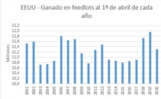 En Estados Unidos, al 1º de abril, la cantidad de vacunos en los corrales de engorde de más de 1.000 cabezas, de acuerdo con lo informado por el Departamento de Agricultura (USDA), era de 11,3 millones de cabezas, 5,5% menos que en el mismo día del año anterior. Es la mayor caída porcentual desde 2003, cuando estalló el problema de la vaca loca en la ganadería estadounidense.