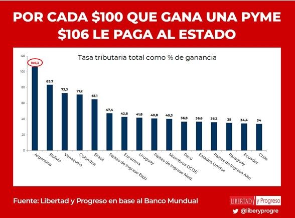 Según datos del informa anual, “Doing Business que elabora el Banco Mundial las empresas argentinas pagan en impuestos un 106% por sobre sus ganancias. Esto significa que en Argentina una empresa 60 empleados que factura anualmente US$12.600.000 con una ganancia del 20% (US$ 2.400.000.) deberá pagarle al Estado US$2.544.000.
