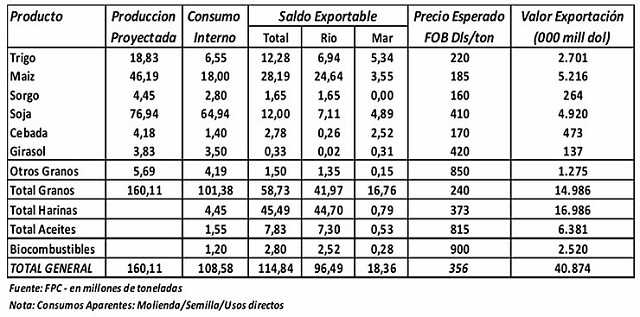 En el Seminario de la FPC en 2017 planteamos en la proyección de producción agrícola al 2027 alcanzar 160 millones de Tn de granos, logrados a partir de una siembra de 39 millones de Has más el doble cultivo. Ello implicaba poder exportar por un valor total aproximado de 40-42 mil millones de dólares (granos, harinas, aceites y biocombustibles) sobre la base de un precio FOB promedio de 350 dólares, en lugar de los casi 300 dólares actuales. Esto es lo que se lograría manteniendo el actual portfolio de exportaciones granarias.