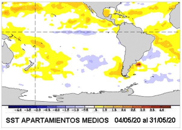 Los océanos que rodean el sur de Sudamérica presentan apartamientos positivos en las temperaturas superficiales. Este es un factor, que sin ser definitivo, suma a favor de mitigar los enfriamientos que puedan llegar desde el Pacífico o el Atlántico sur, quedando las irrupciones de aire polar como las más complicadas a la hora de promover enfriamientos rigurosos. Si esta condición oceánica se mantiene, la tendencia térmica del invierno puede moverse hacia registros que superen los valores normales.