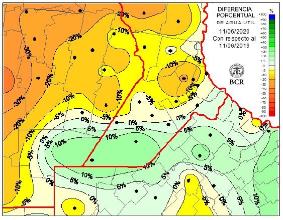Mientras que en la campaña pasada la región núcleo contaba con óptimas condiciones de humedad para la siembra -incluso con algunos excesos puntuales-, este año la siembra se frena por déficit hídrico. El este cordobés cuenta con casi un 20% menos de reservas hídricas para continuar con el avance de las sembradoras. Las semillas de trigo no encontrarían condiciones propicias para emerger. Sin embargo, las capas profundas del perfil del suelo cuentan con una buena recarga. El centro sur de Santa Fe presenta un foco de déficit hídrico en torno a la localidad de Álvarez. En contraste, la franja sur de Santa Fe limitando con la provincia de Buenos Aires es favorecida con 10% más de humedad, mientras que hace un año atrás esta zona presentaba los valores humedad en amarillo.