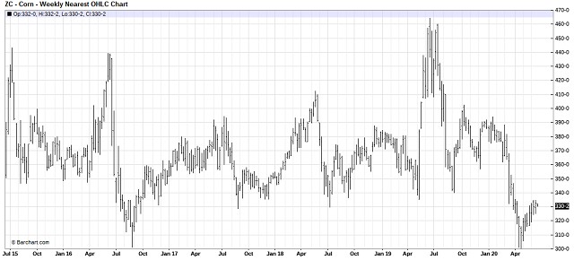 El gráfico de precios, donde queda claro que el 182 usd/tn del 2019 en Chicago (que correspondió a un maíz de 160 usd/tn en Argentina) fue una oportunidad que pocos aprovecharon. Así que, una vez más, si vemos un rally, sea por la razón que sea, aprovechar para capturar valor debería ser una buena decisión
