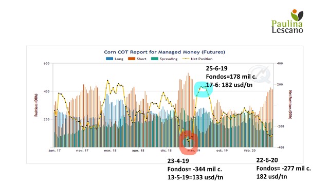 El 23-4-19 estaban “vendidos” en un record de 344 mil contratos= 43 mill tn, el maíz llegó a un mínimo de 133 usd/tn el 13 de mayo, empezamos a ver circular fotos de campos inundados en USA, los fondos, no solo achicaron su posición, sino que pasaron a estar “comprados” en 178 mil contratos= 22 mill tn (en un lapso de 2 meses). Los precios del maíz en el mismo período pasaron de los 133 a un máximo de 182 usd/tn. Bueno no?