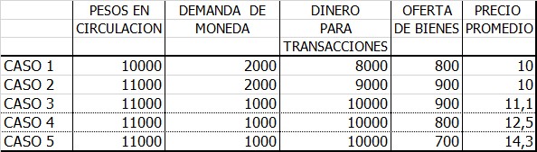 Tomemos el cuadro 1 que muestra cómo se determina el poder adquisitivo de la moneda. El caso 1 hay emitidos 10.000 pesos, la demanda de moneda es de 2.000 con lo cual el dinero que circula en el mercado para transacciones es de $ 8.000. Siendo la oferta de bienes de 800 unidades, el precio promedio es de $ 10.