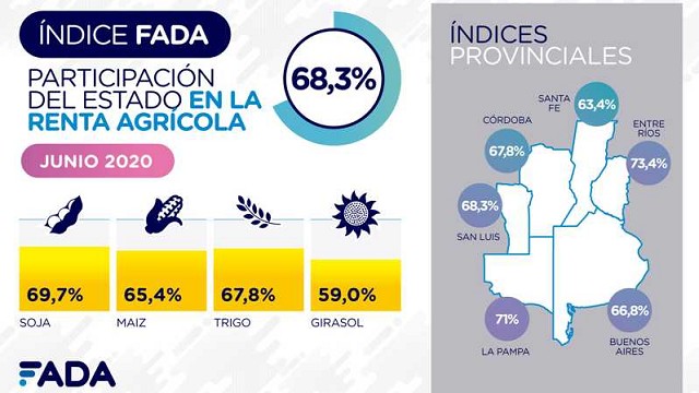 FADA (Fundación Agropecuaria para el Desarrollo de Argentina) publicó su característico Índice FADA. Este informe trimestral, que mide la participación del Estado en la renta agrícola, develó que de cada $100 de renta (ingresos menos costos) de una hectárea promedio, van $68,30 al Estado en impuestos nacionales, provinciales y municipales. Mientras que el promedio ponderado de cultivos a nivel nacional es de 68,3%, la participación del Estado en soja es del 69,7%, maíz 65,4%, trigo 67,8% y girasol 59%.