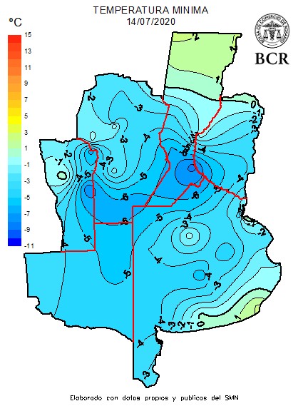 La franja que une el sur de Santa Fe con el sur de Córdoba muestra hoy, martes 14 de julio, los registros más bajos de la región pampeana con 4 y 8 grados bajo cero. Incluso hacia el sur han sido más moderadas las marcas térmicas. La circulación fría desde el sur del país y la permanencia de un centro de alta presión han dominado durante la primera quincena de julio, agudizando el problema de la falta de agua. En la región núcleo, desde el 2 de julio los termómetros vienen sumergidos bajo cero grados y la región no recibió agua: solo en Carlos Pellegrini se registró un milímetro en este periodo de tiempo. En estas condiciones, el crecimiento del cultivo de trigo ha quedado muy limitado. Las pérdidas de hojas y plantas se agravan con cada semana que pasa y esto se pronuncia hacia el oeste. En el sur de Córdoba la falta de agua previa y la helada, que alcanzó registros de 6 a 8 grados bajo cero, pueden dejar un fuerte impacto productivo en trigo.