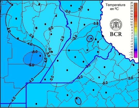 En San Luis, Villa Reina marcó -7,9°C. Y en el sur de Santa Fe, Rosario tuvo el día más frío del año en Rosario con -8,4°C. Hace 67 años que no se registraba una marca tan baja. La última vez que la ciudad marcó una temperatura similar fue en julio de 1953, con -8,8°C. Este dato fue registrado por el Servicio Meteorológico Nacional en su estación del Aeropuerto Internacional Rosario "Islas Malvinas", ubicado en Fisherton, donde, por las características del lugar, los valores suelen ser inferiores a las mediciones del casco de la ciudad. Pero el dato está en línea con los registros que hubo en la región y fueron medidos por la red de estaciones meteorológicas del GEA de la Bolsa de Rosario. En Córdoba, Canals registró -6°C y Monte Buey -5,6°C. La mitad sur de Santa Fe marcó registros bajo cero. El Trébol marcó -6°C, Pujato -4,4°C y Godeken -3,5°C. Los termómetros del norte bonaerense marcaron -4,1°C en Lincoln y -3,6 en Gral. Pinto. Chacabuco registró -3,4°C.