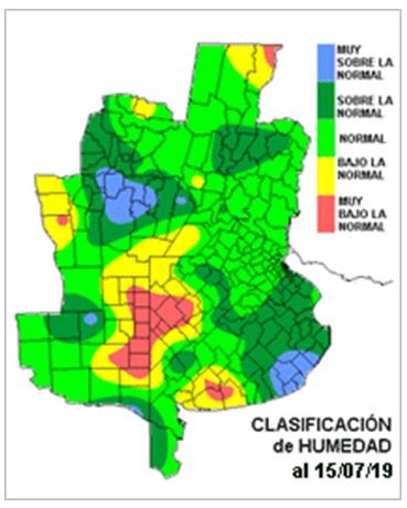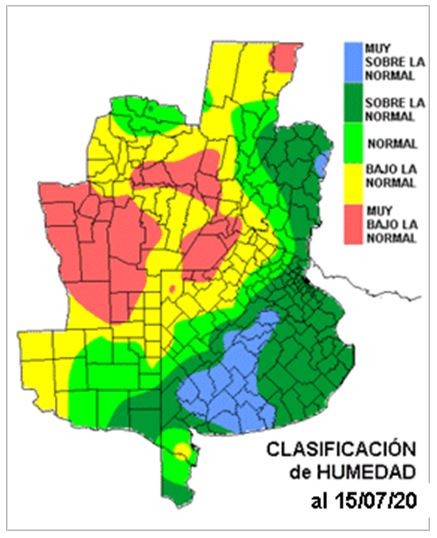 De acuerdo con los valores estadísticos, el retroceso de las reservas es marcado sobre el centro oeste y sur de SF, también afecta en forma parcializada a la provincia de CB, donde normalmente a mediados de julio la disponibilidad de humedad es más ajustada. En términos relativos seguramente los trigales del sur de SF se mantienen en buena forma, pero la comparación de las reservas de humedad a la fecha de una pastura, con las reservas que deberían tener es más marcada en esta área que en las vecindades de CB o el norte de BA. Las provincias de SL y el sudoeste de CB están muy secos y es incipiente el deterioro de la humedad en el noroeste de BA y LP.