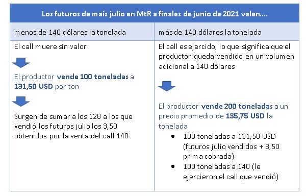 El productor entonces podría vender (o lanzar) opciones call para mejorar el precio mediante el ingreso que significa la prima cobrada. Viendo los negocios realizados el viernes, podríamos por ejemplo vender 100 toneladas de call 140 de maíz julio 21 (un contrato) en Matba Rofex (MtR) a 3,50 dólares por tonelada y vender 100 toneladas de futuros de maíz julio a 128 dólares la tonelada (un contrato).