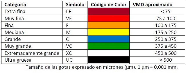 Tabla 1. Clasificación del tamaño de las gotas y su relación con la deriva según ASABE S-572.1